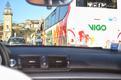 Ciclista a apoiar-se ao autocarro enquanto o semáforo está vermelho